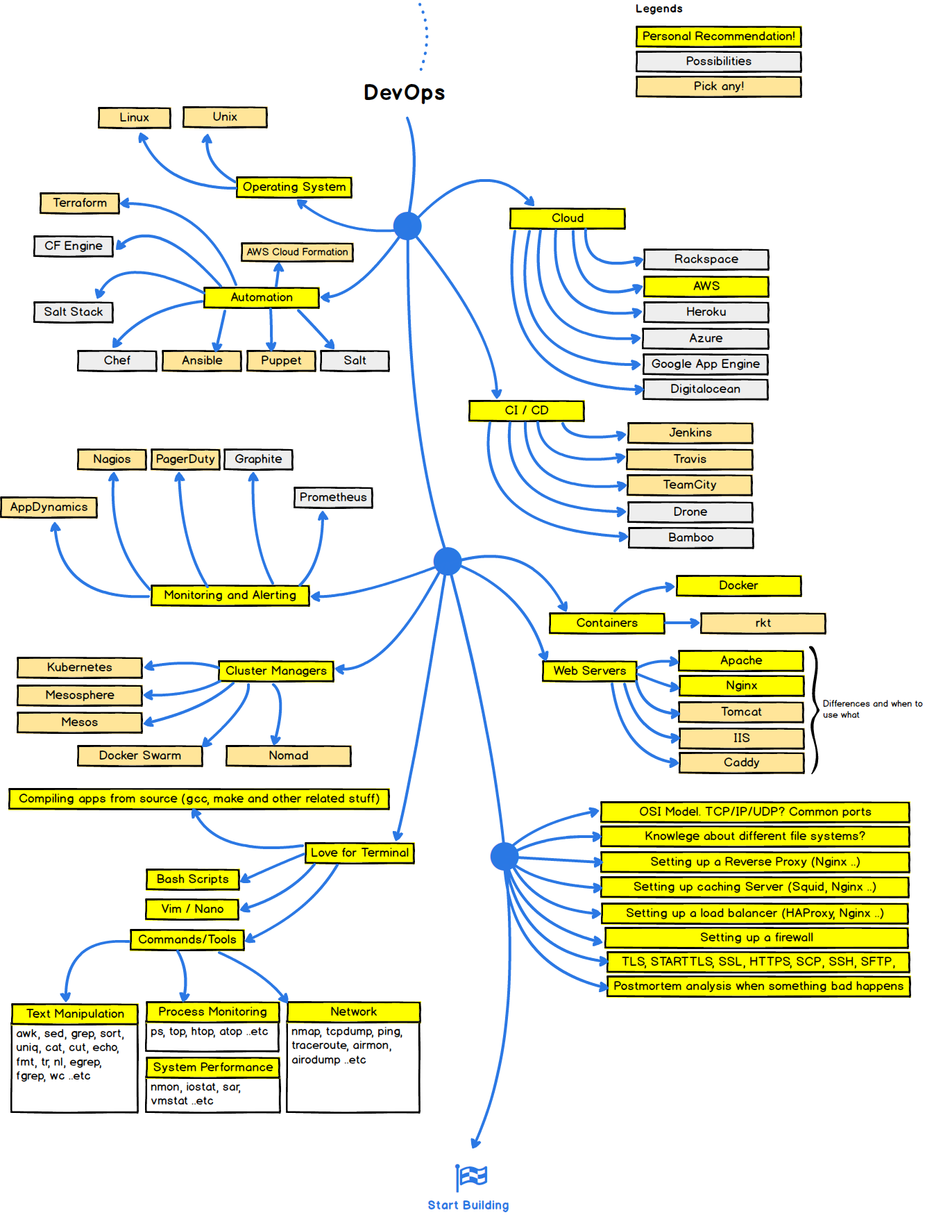 Below you find a set of charts demonstrating the paths that you can take and the technologies that you would want to adopt in order to become a frontend, backend or a devops. I made these charts for an old professor of mine who wanted something to share with his college students to give them a perspective.