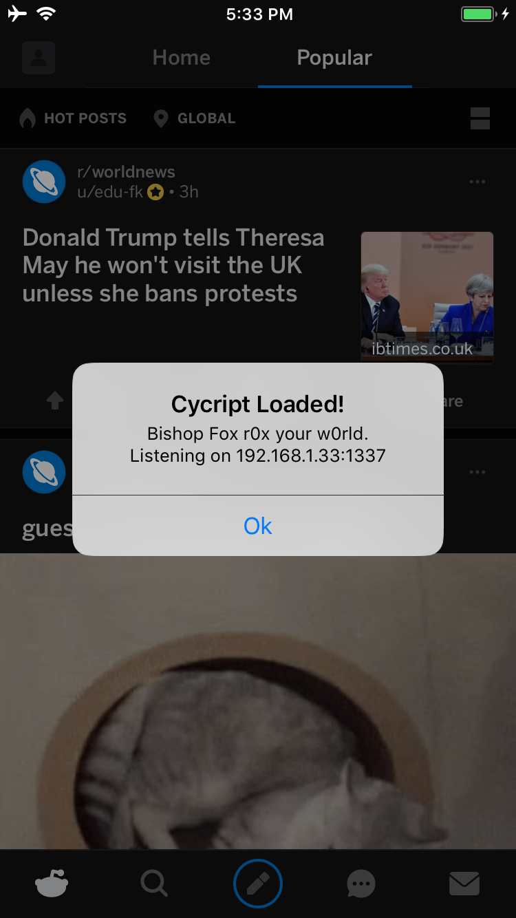 Cs-iPhone:~ root# bash bfinject -P Reddit -L cycript