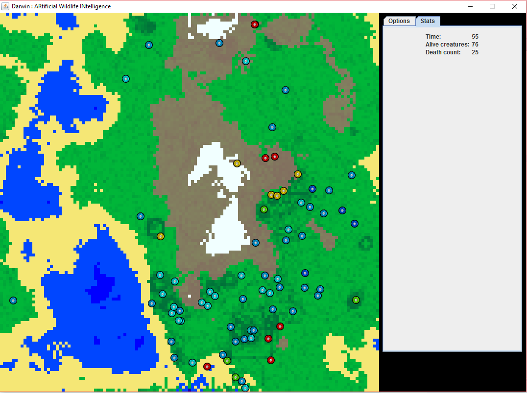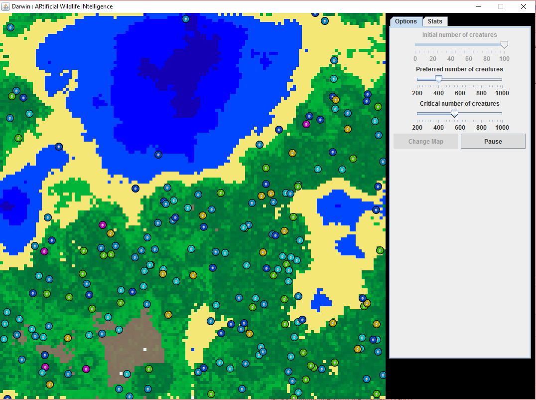 La simulation se fera sur une grille de taille définie par l’utilisateur. Les cases seront un obstacle (eau), de la nourriture, ou juste un chemin. Les créatures seront posées aléatoirement sur la grille, et comporteront des caractéristiques diverses. Leur but est de manger le plus possible pour se reproduire.