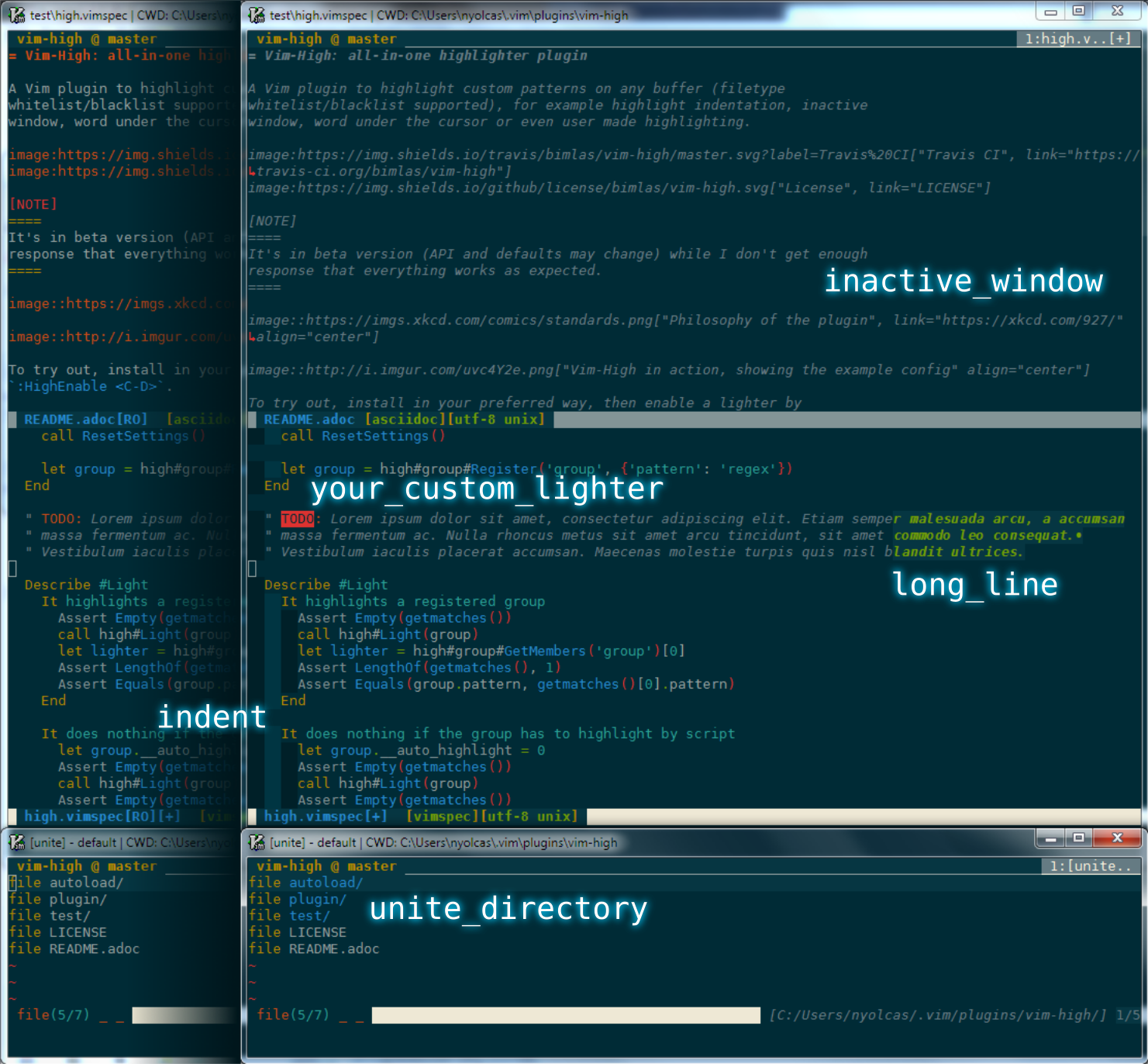 A Vim plugin to highlight custom patterns on any buffer (filetype whitelist/blacklist supported), for example highlight indentation, inactive window, word under the cursor or even user made Vim highlighting.