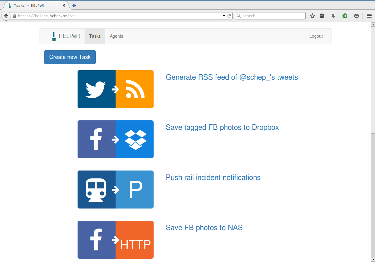 HELPeR is a personal IFTTT clone because who wants to give a corporation access to ALL your online accounts?!