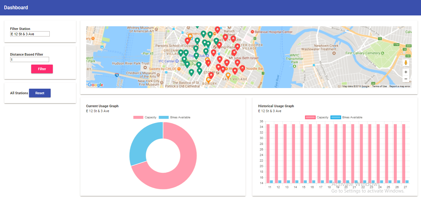 Map View Each bike station is represented by a marker on a map with the following colour coding: Red -> No free bikes Orange -> Less than 50% bikes available Green -> Greater than 75% bikes available